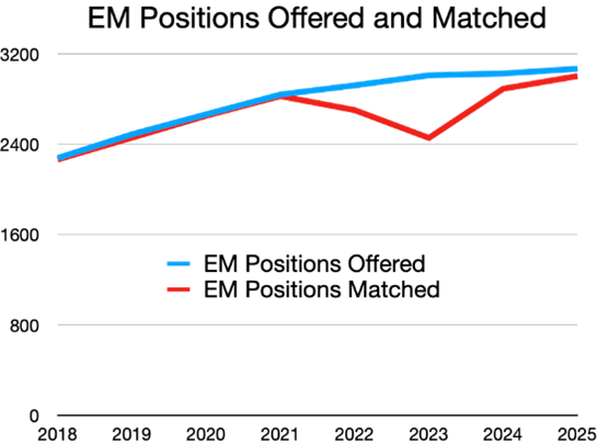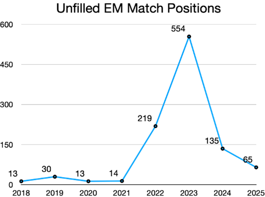 The 2022 EM Match saw an unprecedented initial 219 unmatched positions affecting one in four residency programs. The 2023 Match will see 555 initially unmatched positions, affecting a larger number of residency programs. Although these are challenging results, EM remains a vibrant and appealing specialty for many with almost 2500 new trainees already joining the EM family.