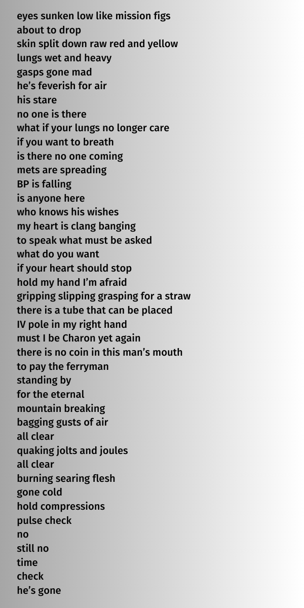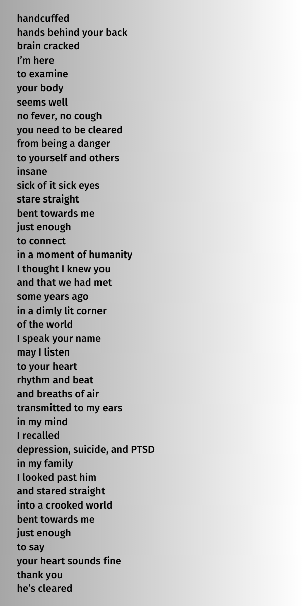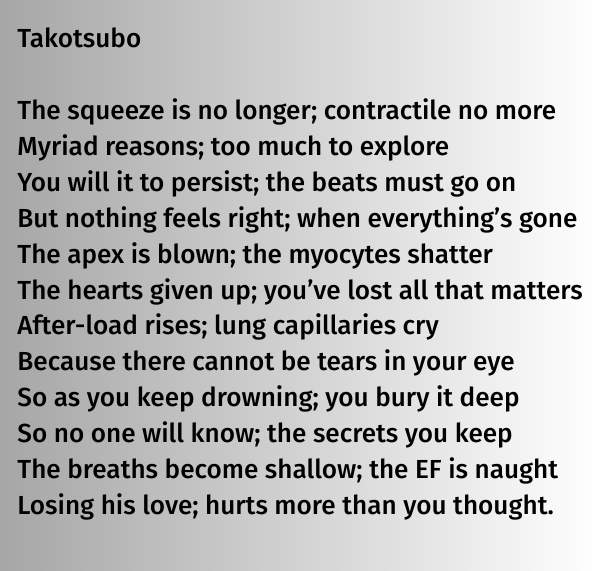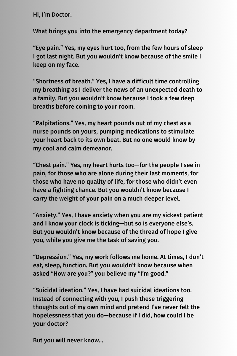 As emergency medicine physicians, we often care for patients in extremis, both physiologic and emotional. Patients often share intimate details with us as physicians. My poetry serves as a reflection on these interactions. I find writing poetry is a way to express the intense emotions that way experience as EM phyisicians.