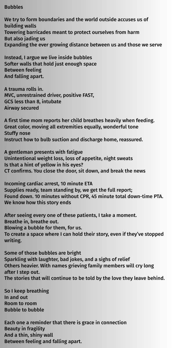 Emergency medicine naturally forces you to compartmentalize and build "walls" which some may argue leads to a loss of connection. "Bubbles" is an alternative look at the analogy of walls that came to mind as I watched my god-children play outside one day. Thin, shiny walls that I can hold specifically for each patient but also let float away. As I go through my training as a resident, I'll continue searching for ways to maintain that sense of connection with my patients and my colleagues. Because everyone deserves a space to share their story.