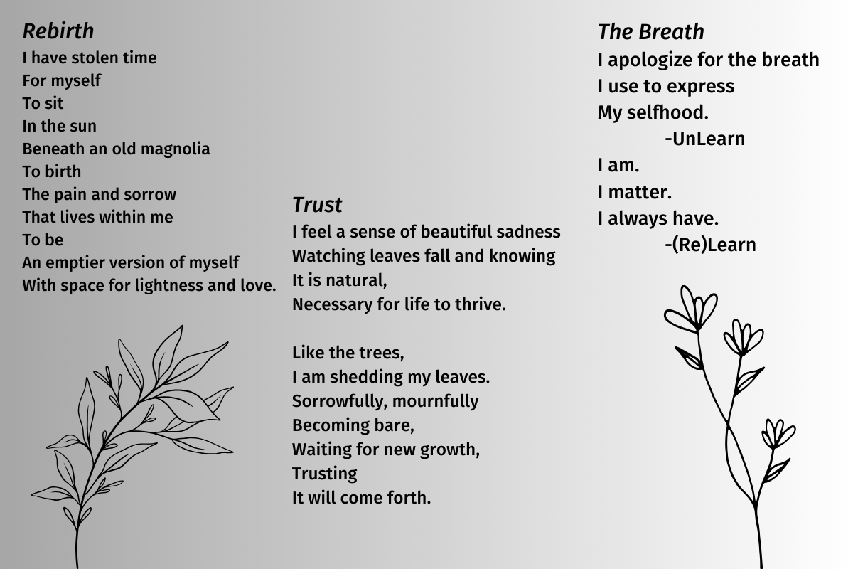 As I reflect on my healing journey, it has been nothing like I expected—it has been longer and more difficult. I can’t just “try harder” and think my way through it. However, it has also been more freeing and transformative—I am learning to live authentically from my humanity with joy and hope. Writing, regardless of form, helps me find myself and my voice, and I share these writings with gratitude.