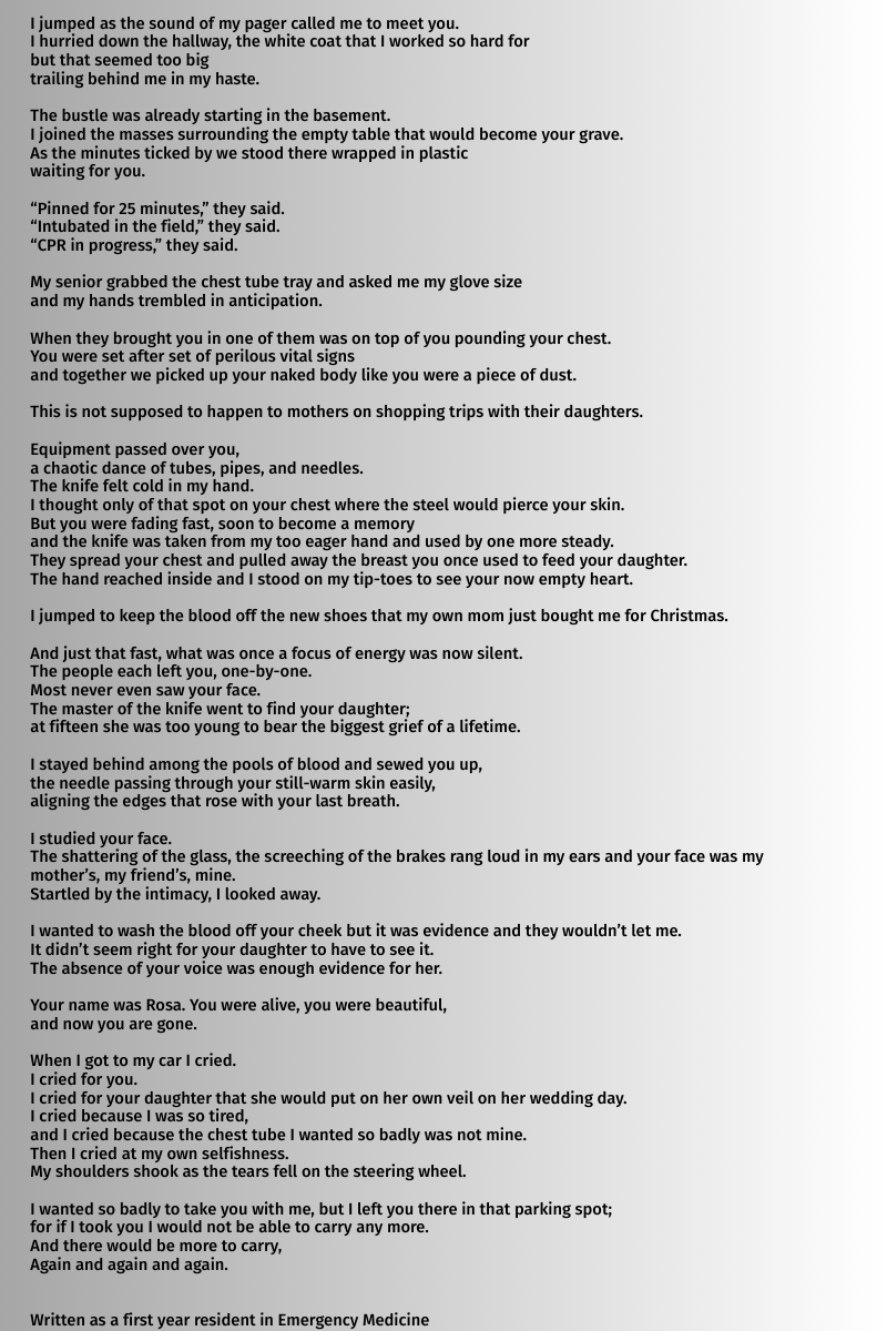 The original draft of this poem was written almost 10 years ago after a night shift covering the trauma service when I was a young EM intern. I have revisited it over the years, making small edits here and there but the "bones" of the poem are the same. Nearly a decade has passed, yet I still remember that moment in my car in the hospital parking garage, tears streaming down my cheeks, really feeling the weight of our profession for the first time. Writing this poem helped me process my emotions from a difficult experience. Revisiting it has also been important, reminding me that with time I have gained experience and expertise but I am still the same human that I was sitting in my car that day, and I hope that I always will be. The patient's name and some small details were changed for confidentiality purposes.